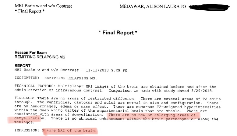Well after a few failed attempts at getting my results from the hospital and my current (amazing) neurologist, I sent a message to my primary care doctor (who has honestly been a godsend to me through all of this) and asked if there was any way she could get me the results. She got back with me a few hours later with the results from my MRI.